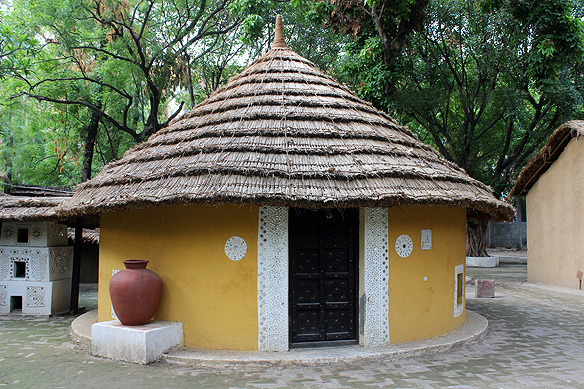 Village Complex [Recreated huts from various Indian States]. Set amongst towering native banyan trees are recreated huts from several Indian States. The Kulu Hut from Himachal Pradesh, made of stone with a roof of slate tiles, is evocative of pine trees and verdant hills. The colourful Banni Hut from Gujarat, decorated with mirror work [shown in the image] is built of sun-dried bricks and has a thatched roof of local weeds. Its circular shape protects the inhabitants from hot desert winds.