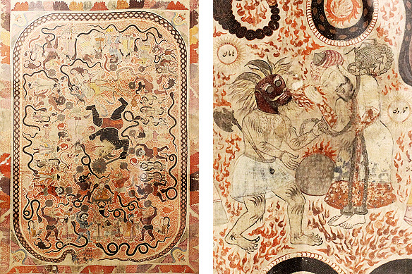 Painting of Paradise and Hell [19th Century, Rajasthani copy of an Iranian painting]. Centred around Islamic concepts of paradise and hell, the upper portion [not in this image] depicts the pleasures of paradise. The section on hell, which forms the bottom part of this huge painting, shows punishments rendered to infidels in the company of dragons, snakes, scorpions, and flames. At its centre is the punishment meted out to Phiraun by Zahak, a popular tale in Persian mythology. [Cultic Craft Gallery; audio tour stop no. 17]
