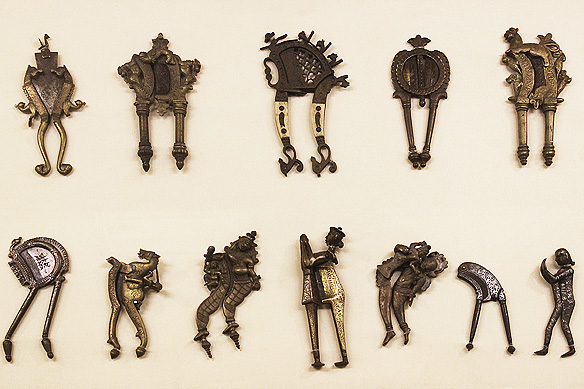 Kondha Bronzes [Odisha, Bronze]. Though not part of the audio guide, I truly feel this exhibit merits a stop and some love. Who would have thought that mere betel nut crackers could be transformed into something so delightful! The 12 pieces have been cast in the solid, and depict mythical creatures, ordinary beings, and geometric patterns, all created with the same attention to detail. [Folk and Tribal Craft Gallery; not included in the audio tour]