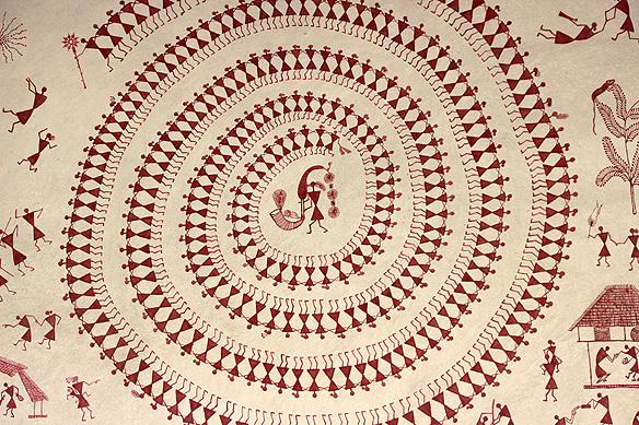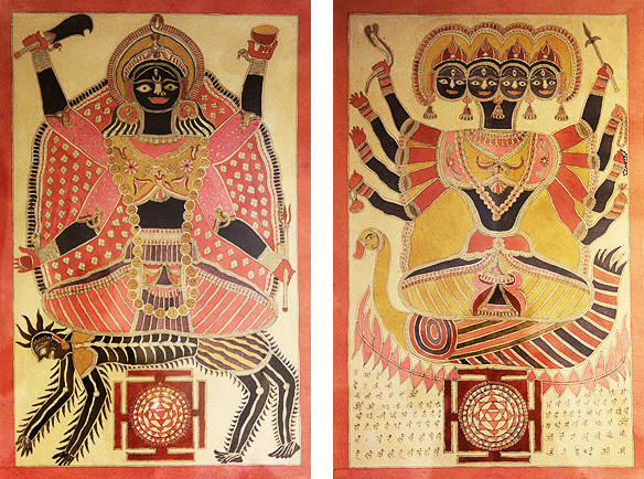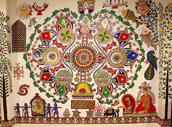 Madhubani Painting [Bihar, Wall Painting]. Though typically gentle and sweet, Madhubani paintings can also be ferocious as the above exhibits illustrate. The top painting is a wall painting called kohbarchitra. It is painted in the room where the newly-wed couple goes to worship the family deity. Fertility motifs such as peacocks, lotus, and fish abound in the composition to ensure procreation. [Folk and Tribal Craft Gallery; audio tour stop no. 13]