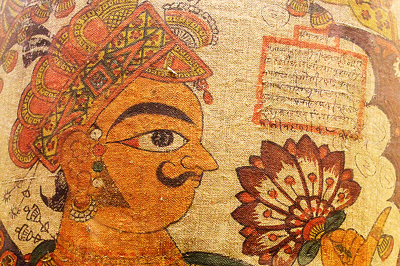 Phad of Pabuji [Rajasthan, Painted Cotton]. Pabuji is a 13th Century hero from Marwar in Rajasthani folklore who died during battle for his subjects. Bhopas, professional singers of Pabuji’s legends, narrate his life story accompanied with large earthen pots and a painted scroll [phad] as they travel through the Thar Desert, entertaining villagers en-route. Stringent rules guide the scroll’s creation and ultimate disposal. The image above depicts Pabuji with the signatures of the artists and the Bhopas who commissioned it. [Folk and Tribal Craft Gallery; audio tour stop no. 9]