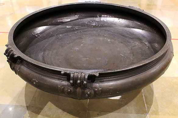 Cauldron [17th Century, Kerala, Bronze]. Musari metal-casters in Kerala have perfected the complex process of casting large utensils [and I assure you, this one is large] in one single piece using the lost wax technique. Known locally as Charakku, the cauldron is used for cooking Payasam, a ritual meal. It is a lovely blend of stark earthen simplicity, with smooth spatial contours which give a seriousness to the size and utility, broken with sophisticated trimmings. [Cultic Craft Gallery; not included in the audio tour]