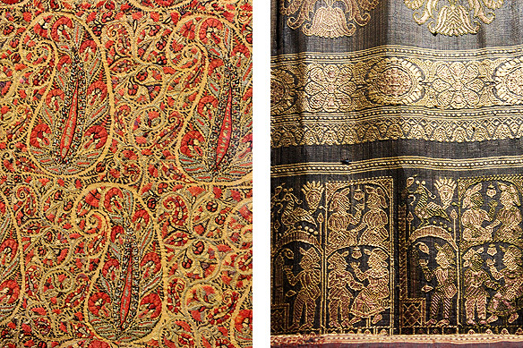 Ikat or Bandha is a resist dye technique that originated in Odisha. Here the yarn is first tie and dyed according to a preconceived design and then mounted on the loom. Native to Rajasthan, Bandhani from the word ‘Bandh’ meaning to tie, is made by plucking the cloth with the fingernails into many tiny bindings that create a design. Brocades are textiles that are richly figured and use one or more supplementary weft or warp to form the motifs. Finally, the Kashmiri Shawls or Cashmere Shawls made of Pashmina wool are characterized by their warmth, light weight, and paisley patterns. [Textile Gallery; audio tour stops no. 20 – 23]
