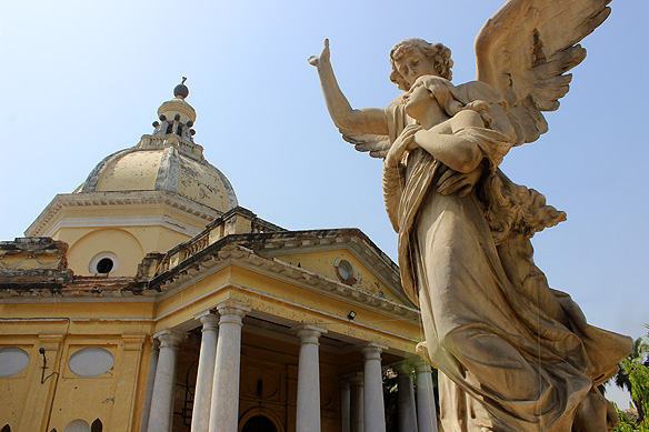 His church is as eclectic in its detailing as his life. Built on a Greek cross plan, the crossing is topped with an octagonal dome, the porch steps embellished with Mughal-styled leaves, and jewel-like stained-glass windows placed in the wrong sequence line the altar wall.