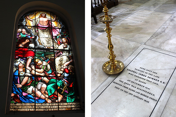On the more somber side, memorials of entire British families murdered in India’s First War of Independence, or the Indian Mutiny [depending on which side you view it from] fill the inside walls. Skinner and the Christian side of his family are buried in a cemetery in the church grounds. He, himself, lies in the apse.