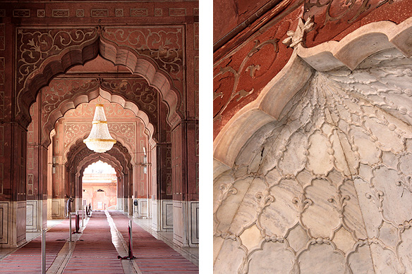 It is a massive mosque. Built to impress. 25,000 worshippers can pray in its courtyard at any given time. The covered section contains 899 prayer mat outlines on its marble floor. Jama Masjid also set the template for future mosques in India: all mosques from this point on were flanked by two towering minarets.