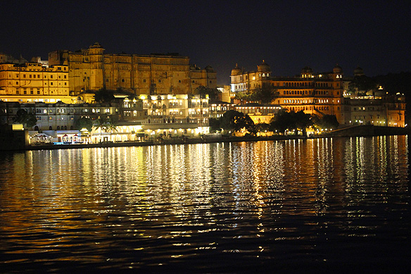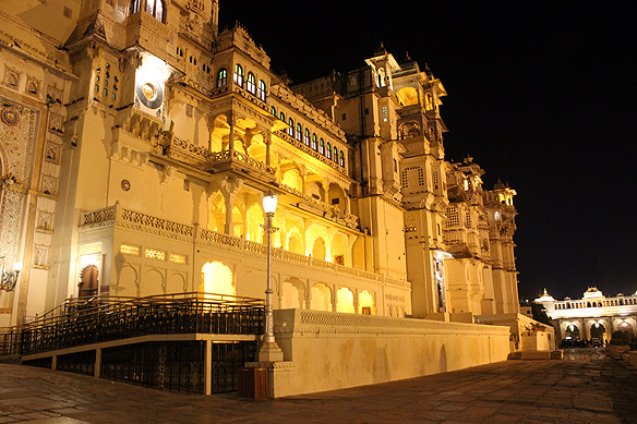 6. Inside Udaipur City Palace at night, bathed in golden light