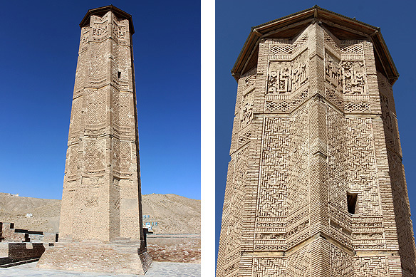Old Ghazni’s 1,000-year-old skyline with the citadel in the distance and Bahram Shah’s minaret on the right; Above: Closeup of Bahram Shah’s minaret. The conical metal roofs on top of the two minarets are a 1960s contraption to avoid rain-water from filling up the hollow minarets and causing further damage.