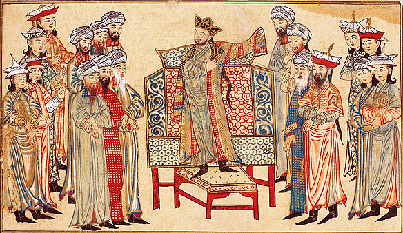 Mahmud of Ghazni [center] receiving a robe of honour from Caliph Al-Qadir in 1000 AD. Painting by Rashid al-Din Hamadani, Edinburgh University Library.