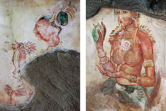 Left: Distorted arms and two nipples on the right breast reveal the artist’s redrawings; Right: Although mainly torso-up depictions, several of the Sigiriya damsels are painted floating above deep-pink clouds leading to the idea that they are ‘celestial nymphs.’