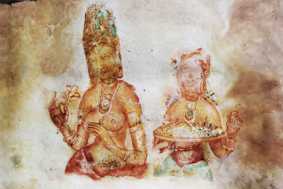 There are various theories about these ladies and the reason they were painted. Whilst one school of thought believes they are all about Kassapa and sensual desire, another believes these ladies from Kassapa’s court are on their way to Pidurangala to make offerings of frangipani and water lilies to the monks who had been relocated there. Then there are those who believe they are Buddhist apsaras [celestial nymphs] and then others who think they are the Mahayana Buddhist goddess Tara herself.