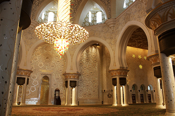 Whether it is its 82 domes, 107-metre-high minarets, courtyard with mosaics of flowers from various countries, 1,096 six-sided marble columns decorated with pietra dura, lunar illumination, the world’s largest hand-knotted carpet, or its qibla wall with the 99 names of Allah—everything has been thought out to the minutest detail in this masterpiece which aims to unite the world. Through architecture.