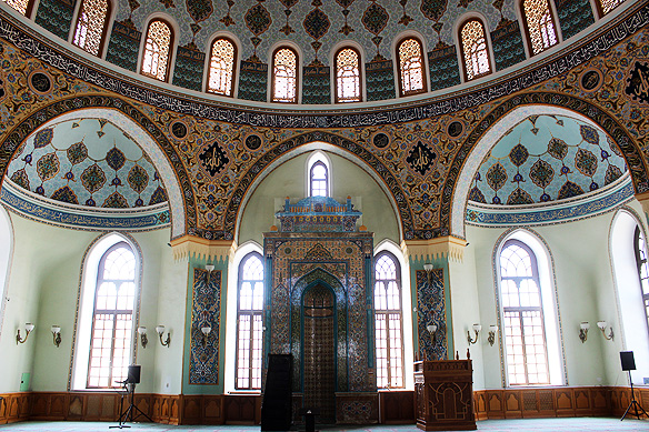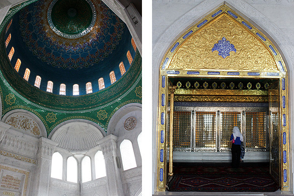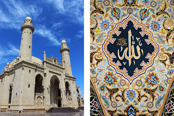 Azerbaijan’s central mosque, the Taza Pir Mosque, is decorated with white marble domes and the Azerbaijani school of painting.