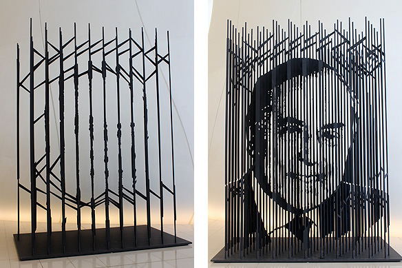 “Heydar Aliyev – 100” installation by Rashad Alakbarov. 100 metal columns, celebrating ex-President Heydar Aliyev’s 100th birth anniversary, morph into his portrait when viewed from a designated vantage point.