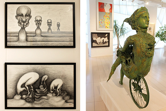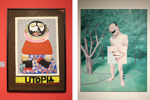 Left: Utopia by London-based multidisciplinary Ghanaian artist Kojo Marfo who fuses Akan fertility dolls with 16th – 17th European court paintings; Right: Summer Garden, Garden of Grins series by contemporary Chinese artist Yue Minjun are a play on cynical realism.