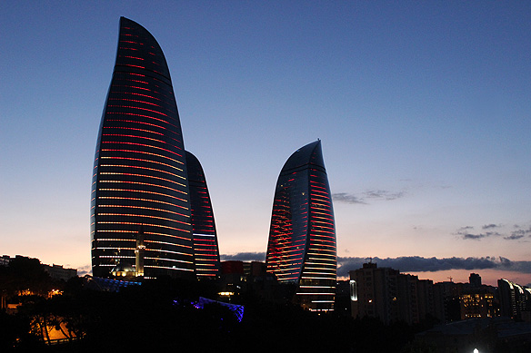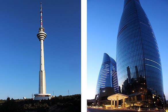 Left: Baku TV Tower [1996] is Baku’s tallest building at 310 metres. Its rotating restaurant, though not famed for its food, has amazing views at night; Right: The three Flame Towers [2013] comprise of a hotel, business centre, and apartments.