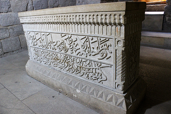 Sarcophagus in the crypt of Seyid Yahya Bakuvi’s Mausoleum inside the palace complex. Bakuvi was a 15th Century Sufi dervish during the reign of Khalilulla I.