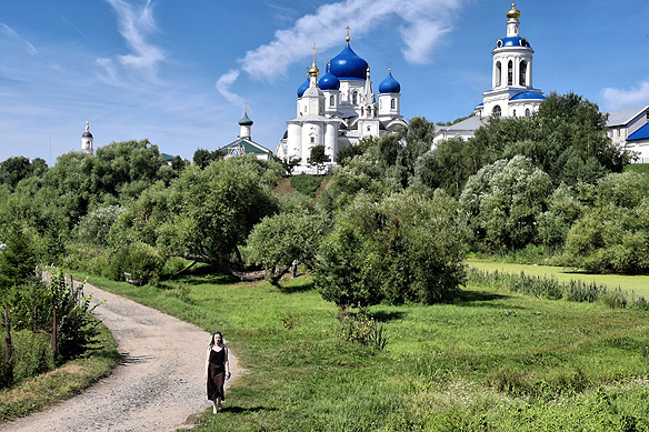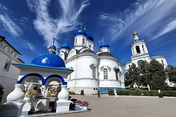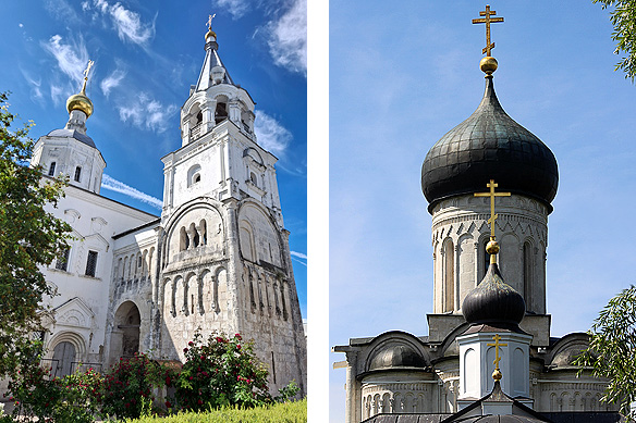 The blue-domed shrine to the left is believed to be the site where Prince Andrei Bogolyubskiy had his vision of the Virgin Mary. Behind it is Our Lady of Bogolyubovo Cathedral [1855].