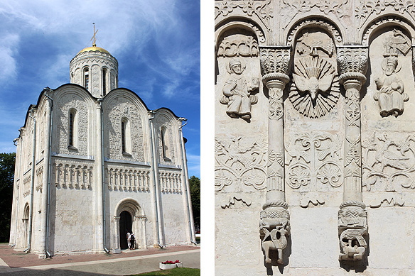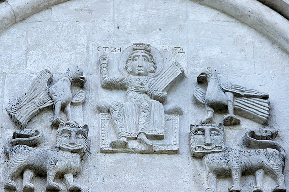 King David, the central figure on three facades of the Cathedral of St. Demetrius, is seen surrounded by lions, centaurs, snow leopards, and mythical creatures. Meanwhile Alexander the Great, the Labours of Hercules, and an enthroned Vsevolod with his sons make guest appearances.