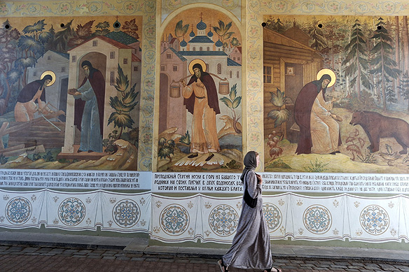 A series of frescoes illustrate the legend of St. Sergius of Radonezh. Russia’s patron saint and founder of the Trinity Lavra of St. Sergius, he is credited with uniting the Russian princes to overthrow the Mongols in 1380.