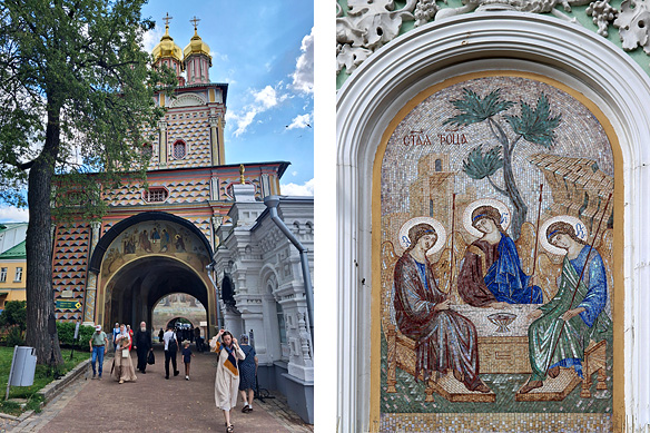 Left: Gate Church dedicated to Nativity of St. John the Baptist [1693-99] built by the Stroganoff family; Right: Mosaic of Andrei Rublev’s masterpiece ‘The Trinity’ on the main entrance. The original 15th Century icon is in Trinity Cathedral’s iconostasis.