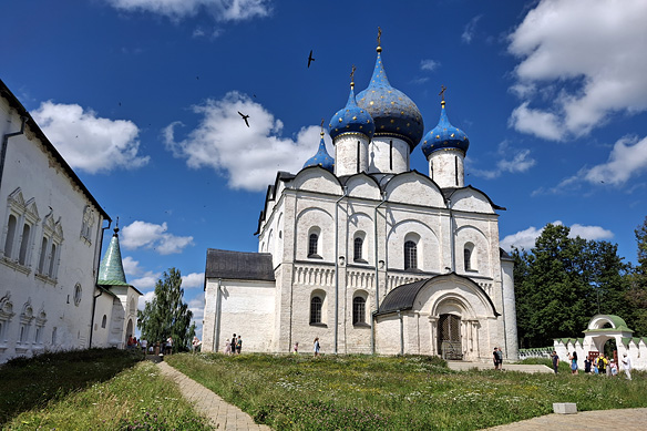 13th Century Cathedral of the Nativity with its five star-spangled domes in Suzdal’s 12th Century Kremlin.