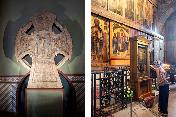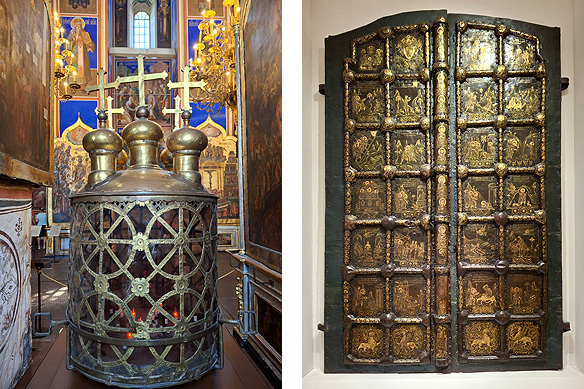 Treasures of the Cathedral of the Nativity. Left: 17th Century portable copper lantern shaped as a 5-domed church; Right: Gilded copper ‘Golden Doors’ etched with Biblical scenes in the museum housed in the Archbishop’s Palace next door.