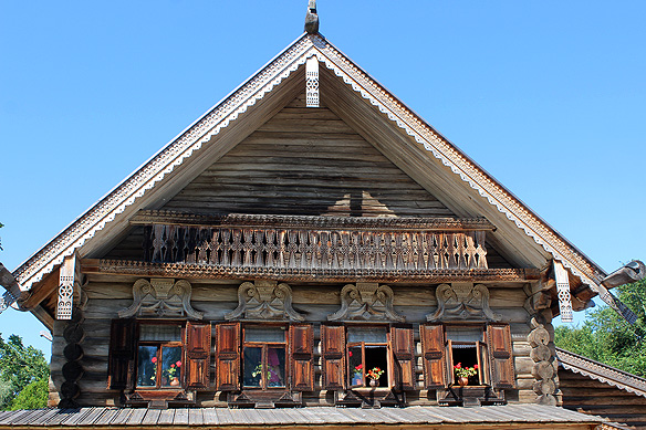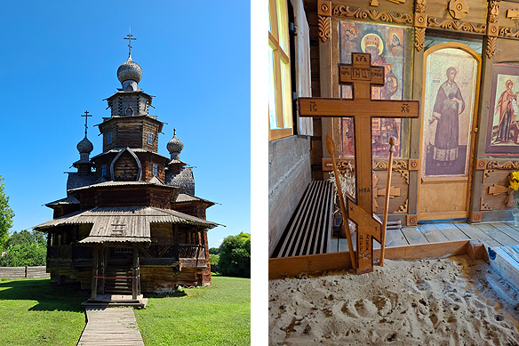 In Russia, before stone, there was wood, and even after stone, there was wood. The 1756 Church of the Transfiguration [left] and inside the 1776 boat-shaped Church of the Resurrection in Suzdal’s Museum of Wooden Architecture.