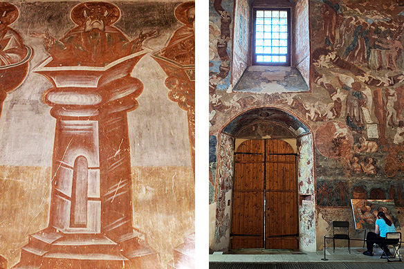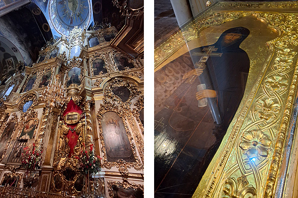 Art abounds in Veliky Novgorod’s churches. Left: Theophanes the Greek’s Old Testament Trinity painted in 1378 in the Church of the Transfiguration [1374]; Right: An art student at work in the Znamensky Cathedral/ Cathedral of the Icon of Our Lady of the Sign [1682].
