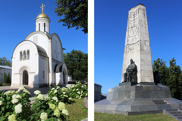 Left: Holy Spirit Church [1476]; Right: Peter the Great’s daughter Empress Elizabeth’s baroque 88-metre-high ice-blue bell-tower [1740-70] with a 1792 obelisk in the foreground.