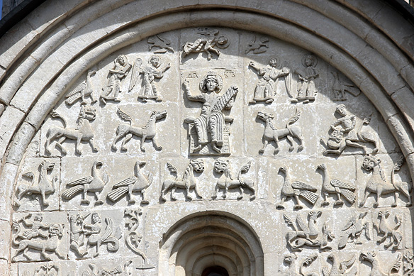 Bas-reliefs of King David surrounded with mythical creatures on the Church of the Intercession’s limestone facade.