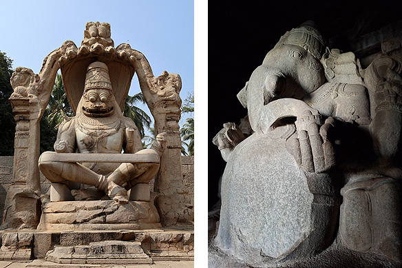 For the Vijayanagar sculptors millennia later, these boulders ended up being a boon from which they could hew gigantic effigies of Ugra Narasimha [6.7 metres tall] and Kadalekalu Ganesha [4.6 metres tall] in the round.