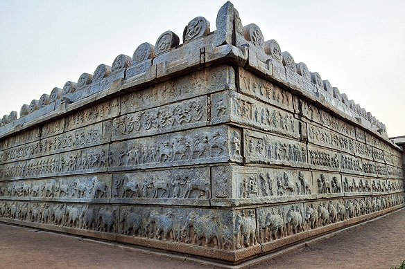 Scenes from the Mahanavami celebrations make a second appearance on the enclosure walls of Hampi’s magnum opus—King Devaraya II’s 15th Century Hazara Rama Temple.