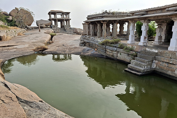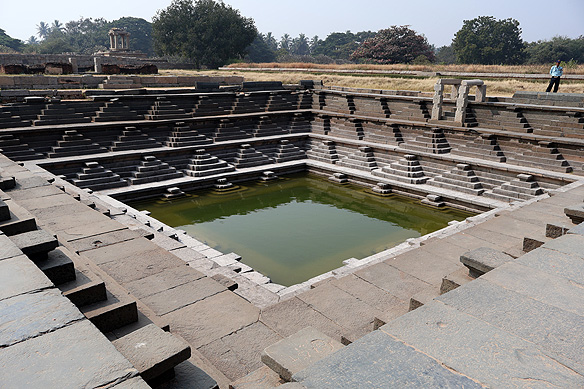 Hampi’s palaces and temples were mostly carved out of the indigenous golden-hued sandstone, with green schist and cuddapah used intermittently for embellishments. Except for one—the gigantic 5-tiered stepped water tank or Pushkarini fed by aquifers inside the royal enclosure made wholly of black schist.