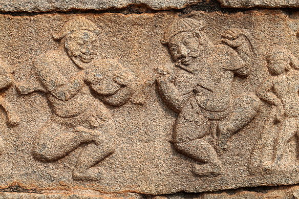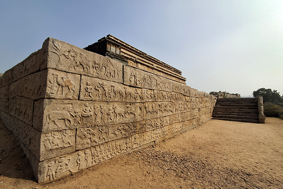 The Vijayanagar kings celebrated the ninth and final day of Navratri, in which Goddess Durga defeats the demon Mahishasura, with great pomp and ceremony. Foreign dignitaries were invited. Governors pledged their allegiance. Markets brimmed with goodies and livestock from across the world, and there was dance and food and music. How do we know all this, you may well ask. Scenes from the festivities were carved for posterity onto a massive schist-encased platform from which the king addressed the event.