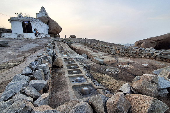 For over a decade, priests have been chanting the Ramayana at the Malyavanta Raghunatha Temple. Come hail or rain. 24 hours, 7 days a week. A short climb up brings one to a huge cleft flanked with two rows of shivlings and nandis.