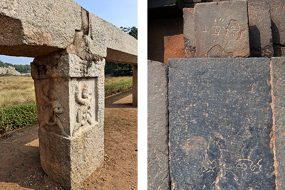 Seven layers of fortifications around the palace area, punctuated with gateways where customs officials collected entry taxes, seven villages, and seven weekly markets. That’s Hampi’s city-plan in a nutshell. One such gateway was the monumental Bhima’s Gateway, a fabulous specimen of military architecture, dressed up with an effigy and panels of Bhima [from the Hindu epic Mahabharata] inside its angular walls.