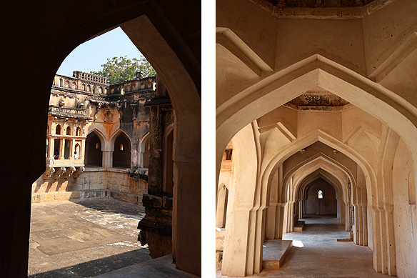 Step into Hampi’s Zenana [ladies] enclosure and you may well wonder if you’re still in staunchly Hindu Vijayanagar. Turkic-Persian lobed arches and ornate domes merge with Indic lotuses and kirtimukhas in the Lotus Mahal, Queen’s Bath, and Royal Stables to create an architectural ensemble that sits in stark contrast to the rest of purist Hampi.