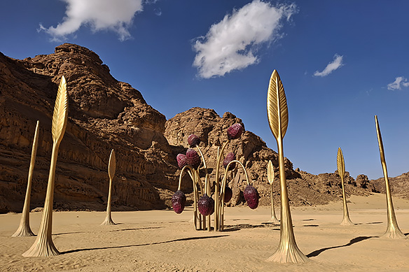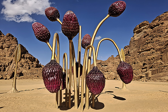 Multiple themes stitch Cuban-born US-based Campos Pons’ Imole Red garden together. To start with, her gargantuan flowers capture AlUla’s intense sunsets in which the canyons change from yellow, ochre, red, to purple and blue. The word ‘Imole’ comes from the Yoruba language and means light. She chooses to represent these colours through native plants that flower on the same visual spectrum, namely, date palms, jujubes, and the allium atroviolaceum.