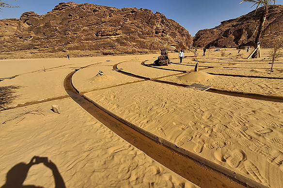If Felemban asks the audience to view the desert’s geology more carefully, multidisciplinary Saudi artist AlFaraj invites the spectator into a labyrinth reminiscent of his childhood in Al Ahsa where palm trees, water channels, soil, and dates were part of everyday life.