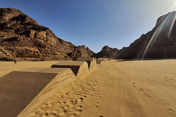 Born to Yemeni parents in Saudi Arabia, Abdu’s installation comprises stratified rammed earth walls made of sands from both AlUla and Yemen in an ancient construction technique. The magic lies in the zig-zag lines. They are the sound waves of the recorded poem which, by a twist of design, also reflect the strata of the canyon.