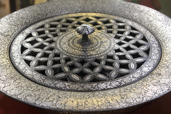 Foot warmer, Bidri: Bidri work is black in colour, never fades or rusts, and is inlaid with silver. The alloy used in making Bidri comprises tin and copper in a proportion of 24:1. It was introduced into India [Bidar, Karnataka] from Persia in the 14th Century.