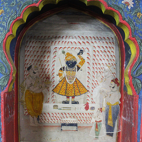 kotah_palace8 Published October 4, 2017 at 584 × 584 in kotah_palace8 The men in the royal family worshipping Krishna in an alcove painting.