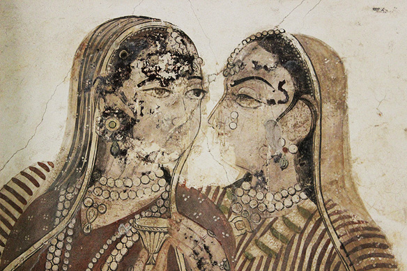 Two women fondle each other in Sheesh or Akbari Mahal.